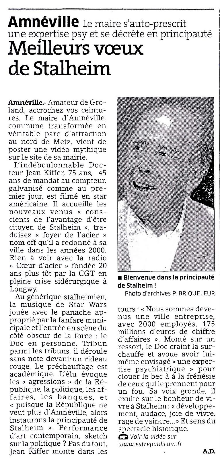 Maire d’Amnéville, près de Metz, depuis 1965, Jean Kiffer a fait ses vœux 2011 à la “principauté virtuelle de Stalheim”, rapporte Rue89. Selon le site, le maire, qui a “transformé ce ‘crassier’ en gigantesque station thermale, station de ski et centre de loisirs (zoo, casino, piscine olympique, patinoire, golf…)”, aurait vu son succès lui monter à la tête.