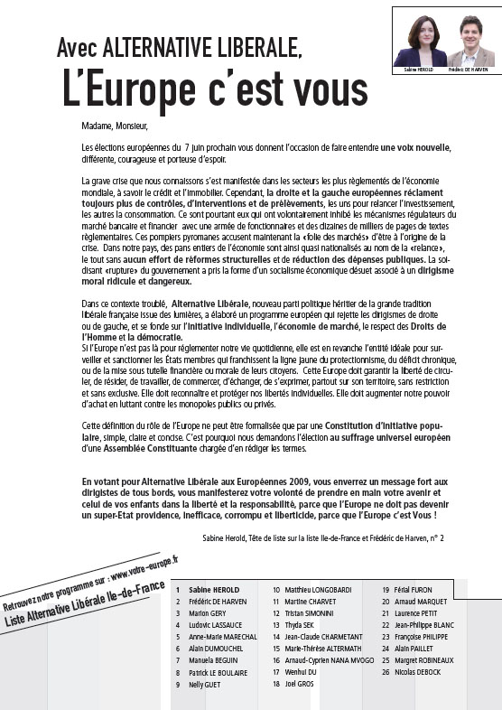 La profession de foi de la liste Alternative libérale aux élections européennes de 2009 pour la région ÃŽle-de-France
