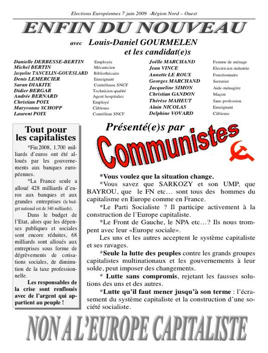La profession de foi de la liste Communistes aux élections européennes de 2009 pour la région Nord-Ouest