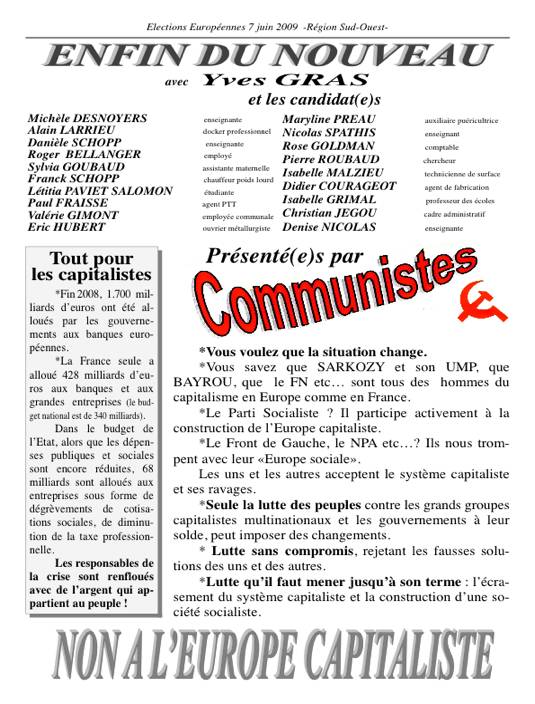 La profession de foi de la liste Communistes aux élections européennes de 2009 pour la région Sud-Ouest