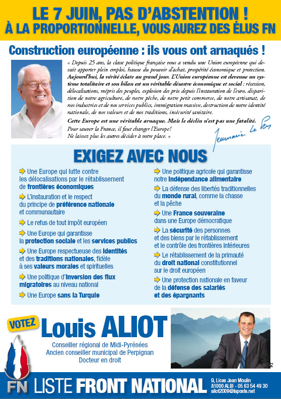 La profession de foi de la liste Front national aux élections européennes de 2009 pour la région Sud-Ouest