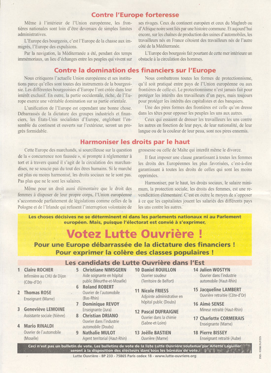 La profession de foi de la liste Lutte ouvrière aux élections européennes de 2009 pour la région Est