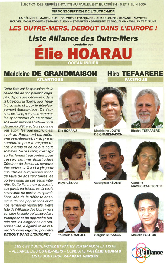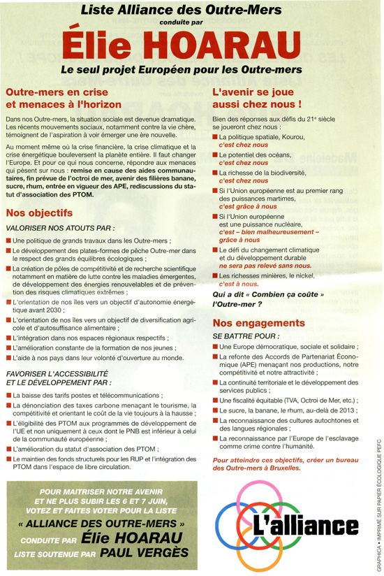 La profession de foi de la liste Alliance des Outre-Mers aux élections européennes de 2009 pour la région Outre-Mer