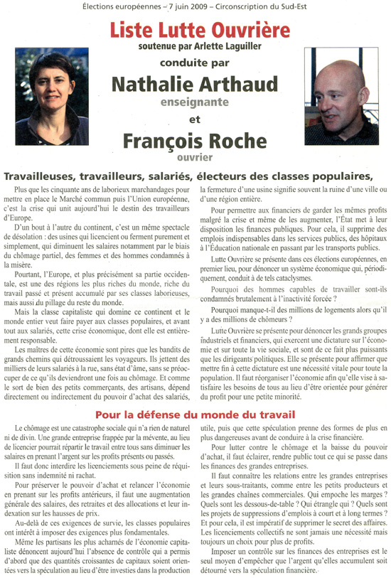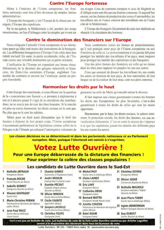 La profession de foi de la liste Lutte ouvrière aux élections européennes de 2009 pour la région Sud-Est