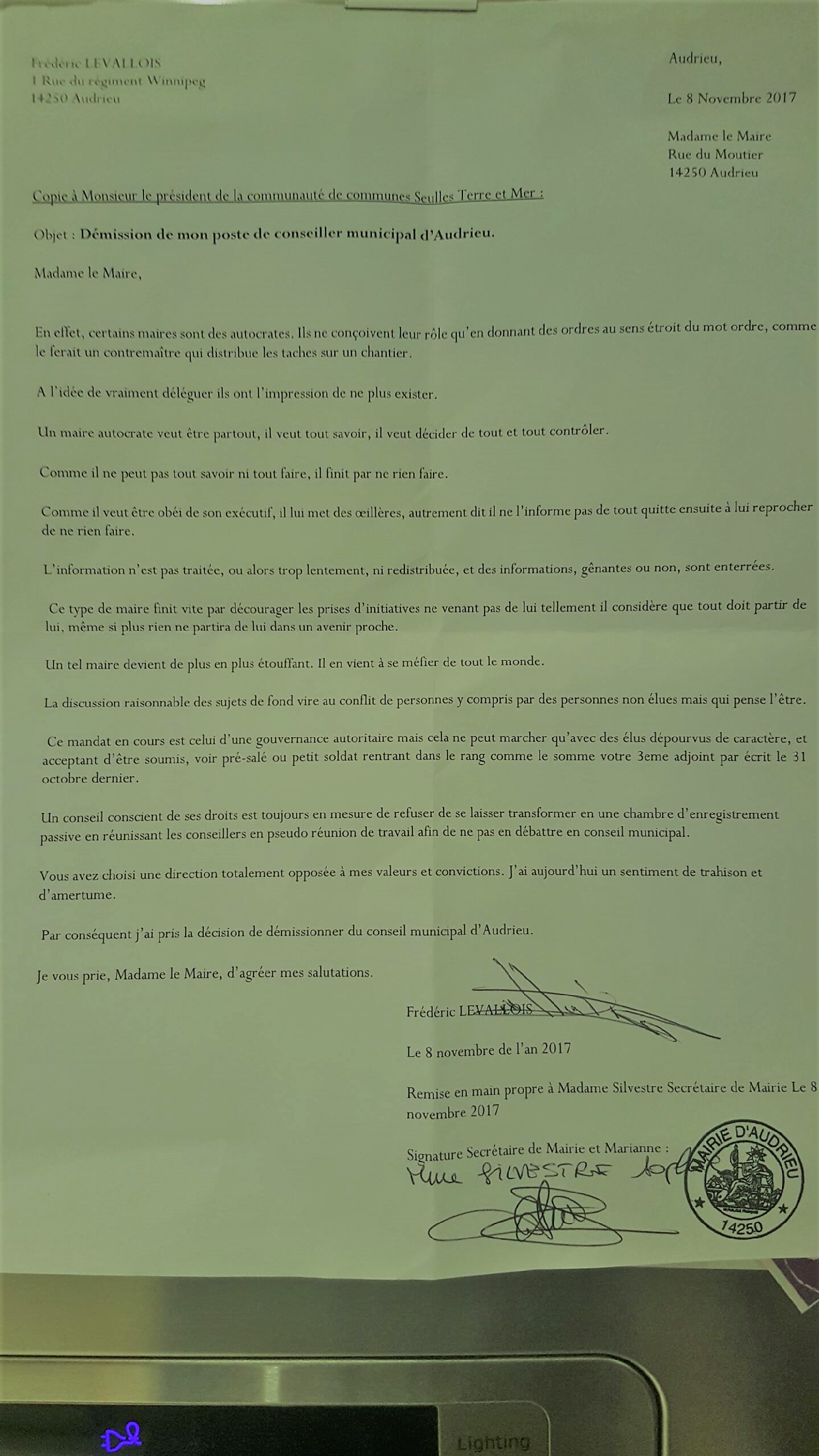 Il reste le cas de Monsieur Levallois, dont la démission n'aurait pas été évoquée lors de la réunion de conseil municipal, et pour une raison administrative, plutôt opportune ce soir du 14 novembre pour la Maire, car elle devait d'abord étre transmise au Préfet, mais dont la copie de la lettre de démission a été portée à notre connaissance après avoir été remise au secrétariat de la Mairie.