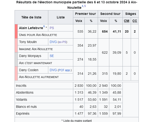La Liste de Tony MOULIN adjoint démissionnaire DVG ex-PS : 23,97%