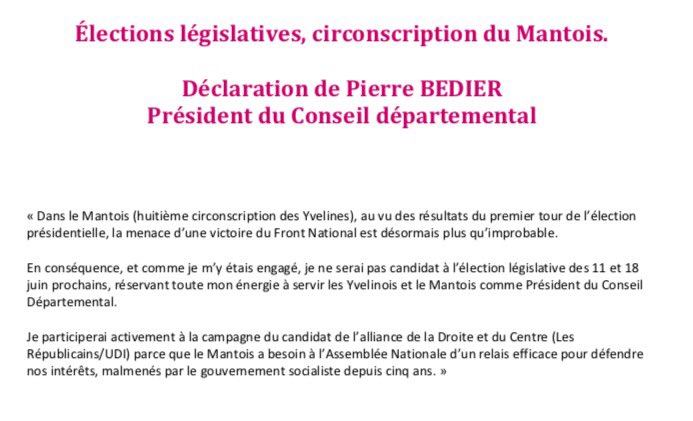 Dans la 8e circonscription, Pierre Bédier renonce.