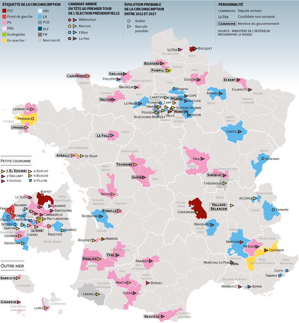 ploumploum a écrit:Ayant été sollicité en MP et sur le modèle des derniers scrutins (par exemple comme en 2015), j'ouvre ce sujet pour compiler les avis sur les circonscriptions qui seront les plus intéressantes à suivre (ministres ou ex-ministres, autres figures de la vie politique, sièges incertains, conquête du FN, affrontements internes à gauche et à droite...)