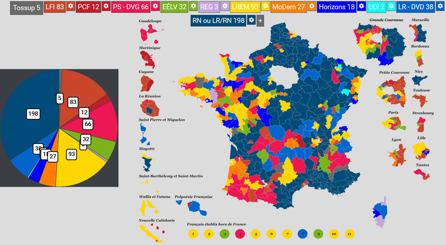 HdF : les deux circos d'Amiens me semblent incertaines. On va voir la capacité de Ruffin de battre la campagne pour le second tour et à Amiens-sud, je n'ai pas trop d'idée précise et les reports de LR seront déterminants. La circo de Seclin dans le Nord me paraît incertaine mais je vois un avantage pour Huyghe tout de même.