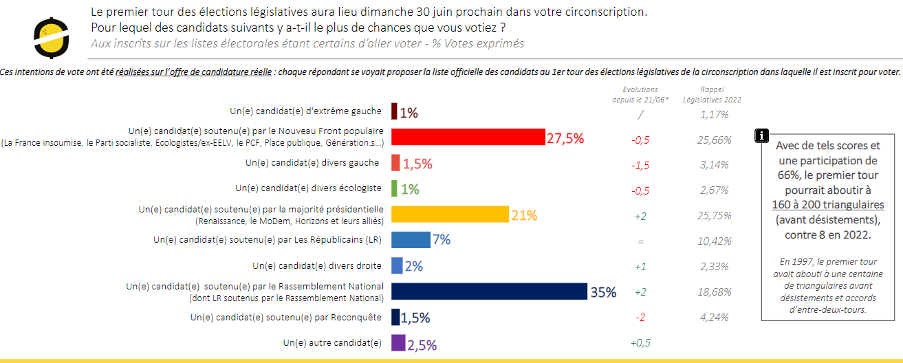 3 sondages IFOP sur 3 circonscriptions différentes, Les "(+-)" sont par rapport au résultat du parti en 2022.