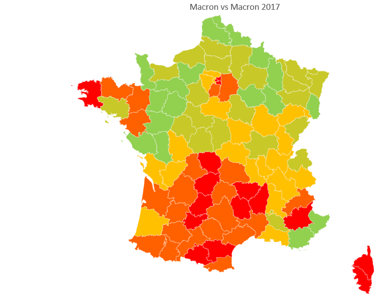 Cela se passe presque de commentaires. Le Sud-Ouest est très représenté dans les départements où Macron sous-performe par rapport à il y a cinq ans. L'est de l'IdF se distingue aussi. Il y a aussi la Bretagne mais là , c'est surtout que Macron a eu du mal à progresser tant il était déjà haut il y a cinq ans.