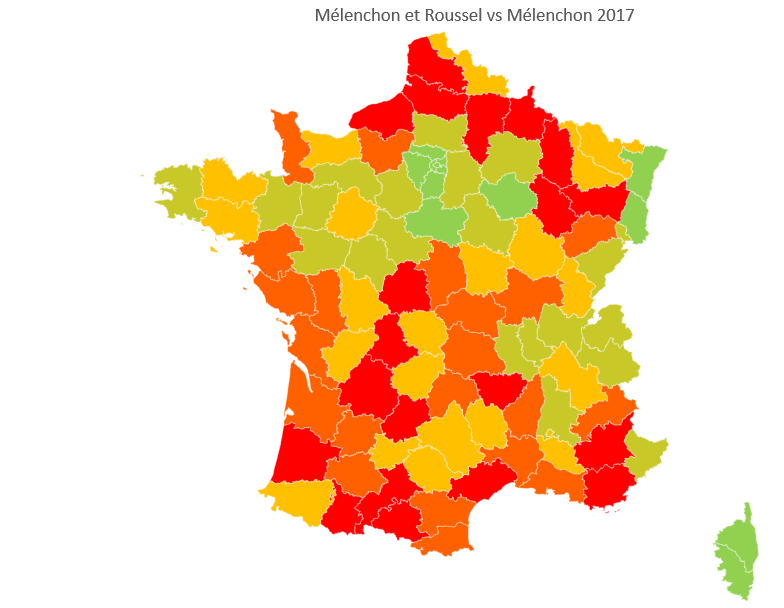 Je mets la carte qui compare Mélenchon et Roussel avec Mélenchon 2017 mais peu de choses bougent. Tout au plus quelques départements du centre de la France comme l'Allier et la Corrèze sous-votent un peu moins pour l'ensemble Mélenchon/Roussel que pour Mélenchon seul.