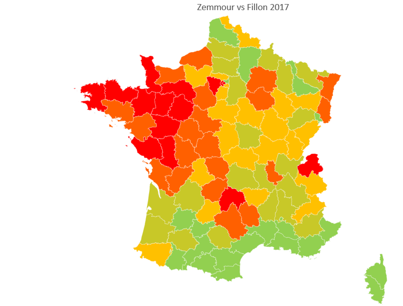 En comparant l'attelage Zemmour+Pécresse à Fillon en 2017, on voit une nette sous-performance dans l'Ouest où Zemmour et Pécresse ont tous deux nettement sous-performé par rapport à Fillon en 2017. À l'inverse, nette surperformance dans quasiment tous les départements du Sud à l'exception d'une tache orange Aveyron, Cantal, Lozère.