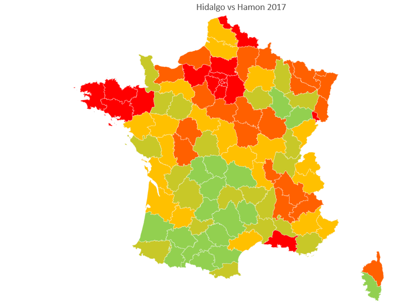 L'analyse change du tout au tout en comparant la carte électorale de Hamon avec celle de Hidalgo+Jadot. Le vote Jadot+Hidalgo baisse cette fois-ci par rapport au vote Hamon dans le Sud-Ouest tandis que les progressions se font cette fois plus dans le quart Sud-Est et notamment en Rhône-Alpes où le vote pour les Verts est historiquement haut. Les Pays de la Loire sont également concernés avec un vote EÉLV plus important que la moyenne nationale.