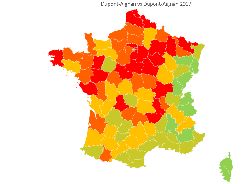 Derrière l'effondrement du vote NDA se cache là aussi des disparités : il résiste énormément sur toute une frange est de la France allant de l'Alsace jusque dans les Alpes en passant par la Franche-Comté ainsi que sur tout le littoral méditerranéen et le Sud-Ouest. Les départements oranges et rouges sont très concentrés dans la moitié nord.
