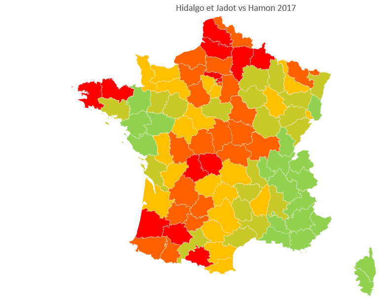 L'analyse change du tout au tout en comparant la carte électorale de Hamon avec celle de Hidalgo+Jadot. Le vote Jadot+Hidalgo baisse cette fois-ci par rapport au vote Hamon dans le Sud-Ouest tandis que les progressions se font cette fois plus dans le quart Sud-Est et notamment en Rhône-Alpes où le vote pour les Verts est historiquement haut. Les Pays de la Loire sont également concernés avec un vote EÉLV plus important que la moyenne nationale.
