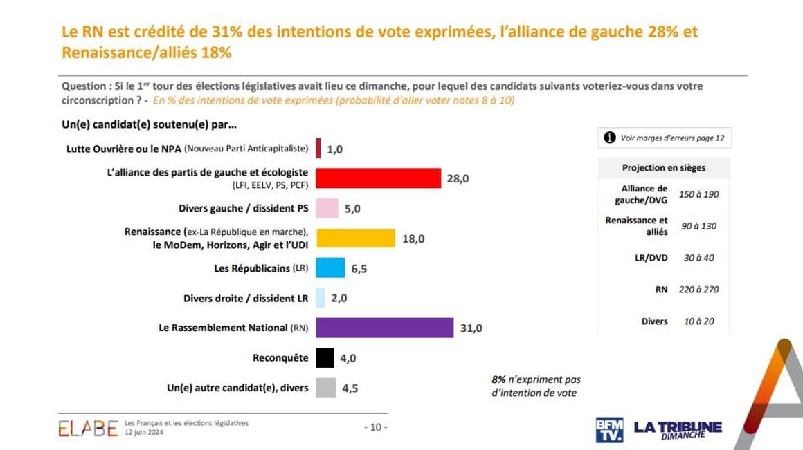 selon Elabe. Avec une participation aux alentours de ~65%, dans de nombreuses circonscriptions la participation pourrait monter jusqu'à 75%, avec donc un seuil de triangulaire à 16-17% (et donc selon les circonscriptions des triangulaires RN/Front Populaire/Renaissance ou LR ou DVG anti-Front Populaire).